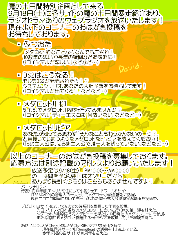 取り急ぎ、こちらのお知らせのみ。 今後、魔の十日間に関するお知らせなどはこちらの サイトで行ないますので、リンクして頂ける場合は こちらの方へよろしくお願いいたします。