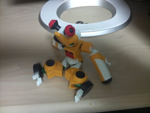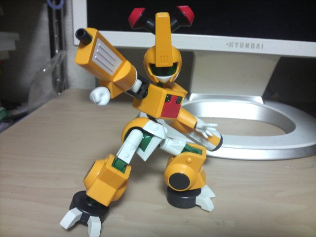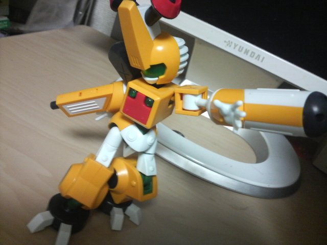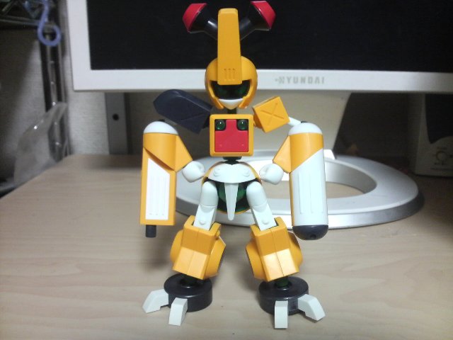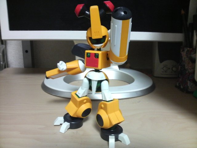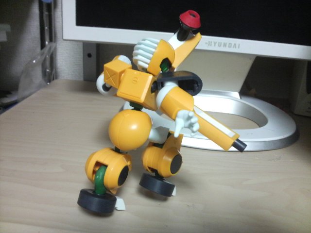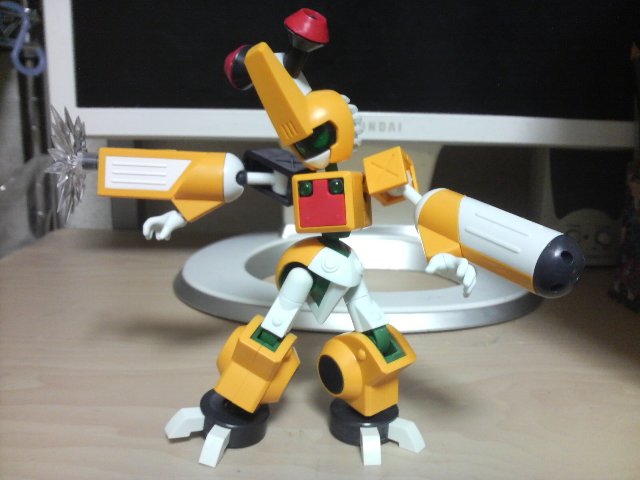 「ガンノウズ」が発売開始! ご多分に漏れずあけいも買って来て組みました! 以下、基本的ガンノウズポーズ。 携帯のそれなんで色々ご容赦。 非常に組み易くて、更に言えばほとんどの部品が 「どこの何のパーツかわかる」のでかなりスムーズに組めます。 なんかこう…「知っている……俺はコイツの組み方をしっているぞ!」 みたいな。 可動域については、上半身はいい感じです。 下半身、特に股はほとんど開けないので腰を落とすポーズが難しく、 足首もほぼ動かないので外側に足を開いたときなんかの 接地はやや厳しい……かな? しかしそれをおぎなって余りある「メダロットらしさ」に感動の嵐。 関節部分はきちんと布っぽく歪んだ意匠なんかたまんないです。 背中のメダルハッチもちゃんと開閉式、メダルストッパーも開閉式。 初心者の方でもさっくり組めるみたいなので、ぜひおすすめです。 シリーズが広がれば更にパーツを組み替えて反撃反撃!」 |